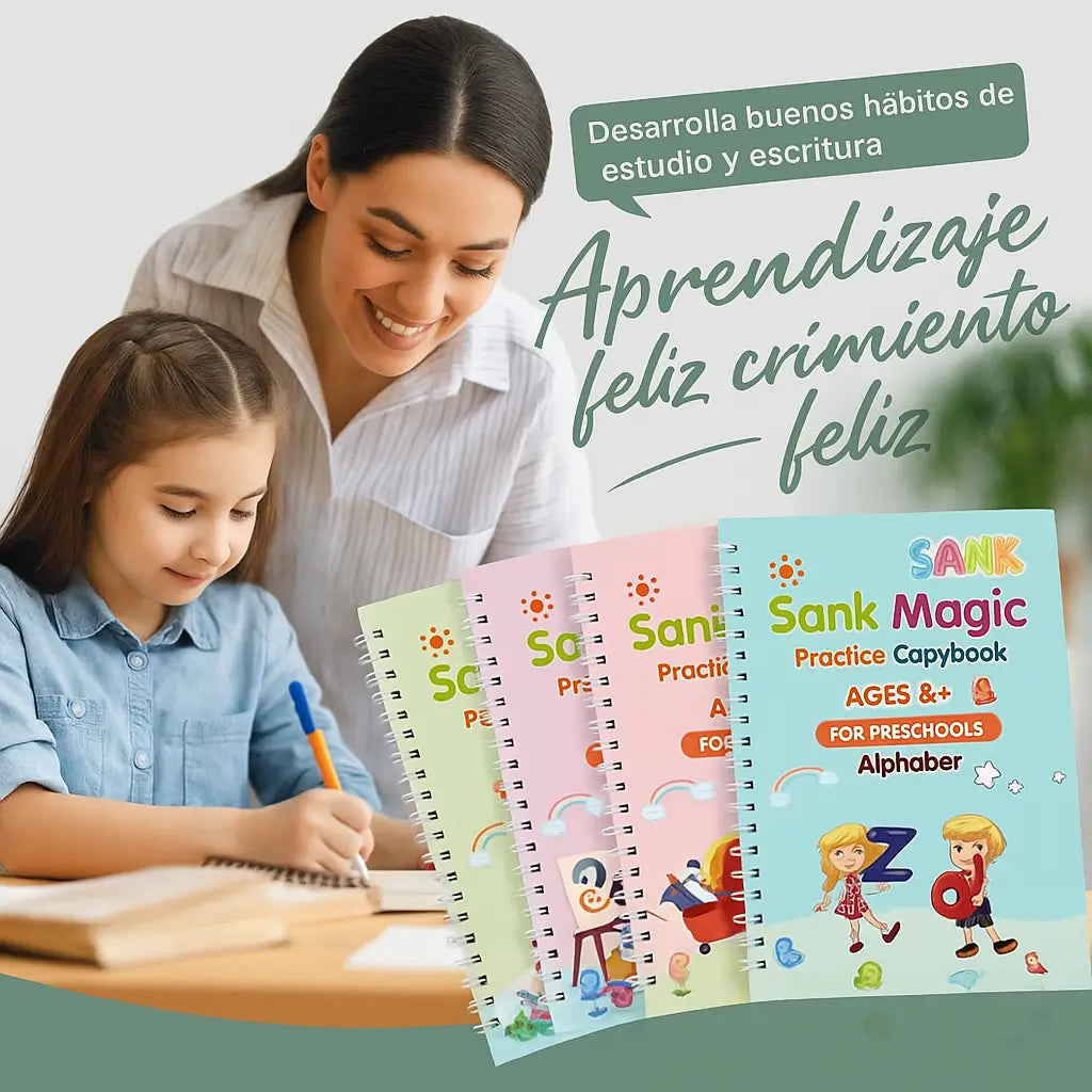 Dale a tu hijo un atajo para escribir que se ve, se siente y se repite. Combina trayectorias grabadas (en relieve) que guían el lápiz como rieles, con tinta que se desvanece en unos 20 minutos, así cada página se “reinicia” sola para la siguiente ronda.